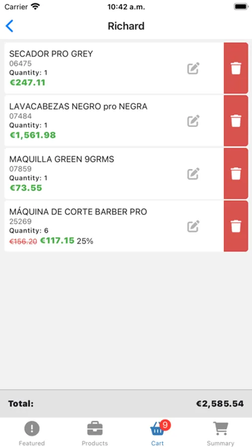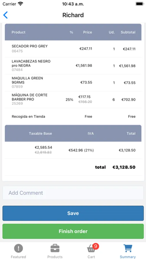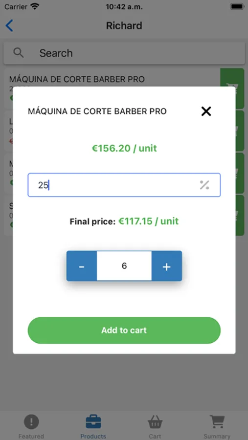 - Permite aplicar descuentos extras especiales a productos en la recogida del pedido, para una mayor libertad de política de precios al comercial.
