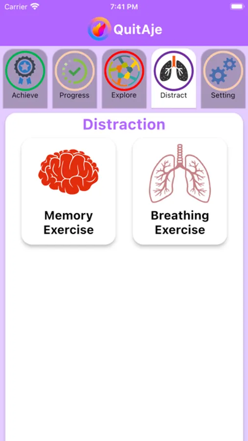 QuitAje is also designed to help distract you from the urge to smoke with a variety of engaging and entertaining features, including games, and guided breathing exercise.