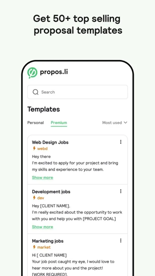 - 50+ Professionally written Upwork proposal templates (We add more templates every week)