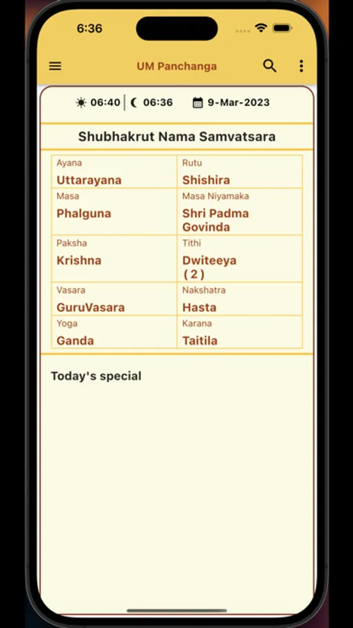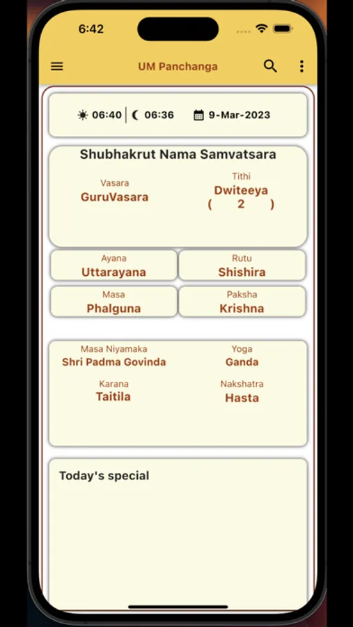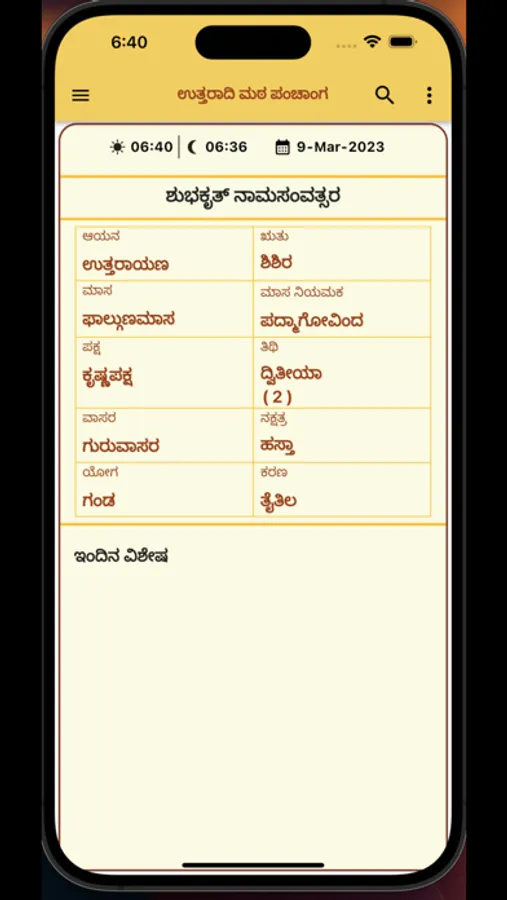 It is targeted for followers of Uttaradi Math and others to know about today's Panchanga in a very handy way with all necessary and appropriate details. It has Samvatsara, Ayana, Rutu, Masa, Masa Niyamaka, Paksha, Tithi, Shradha tithi, Nakshatra, Yoga and Karna. These are the basic details required doing sankalpa before starting any punya karma. It also highlights below the day's special in the chosen language. User can change language under settings.