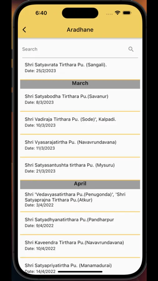 User can navigate using calendar months and have quick and broad view of the month. If required, more details can be seen on tap on specific date. Search works in English for now. It is global search based on data entered in English only. Enter the text and tap done to view the list of options. There is Menu search also available in English only.