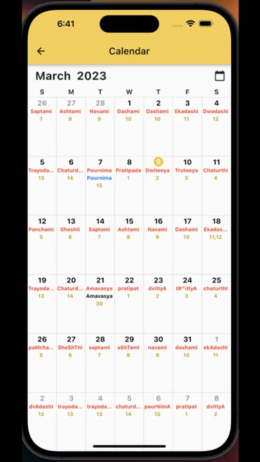This version has a calendar view with number of tithi, displayed on specific calendar date.
