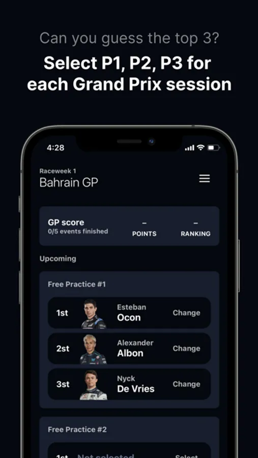 Introducing the ultimate Grand Prix prediction game! Do you have what it takes to guess the top three finishers of each session? Put your racing knowledge to the test and challenge your friends with this thrilling mobile app game.