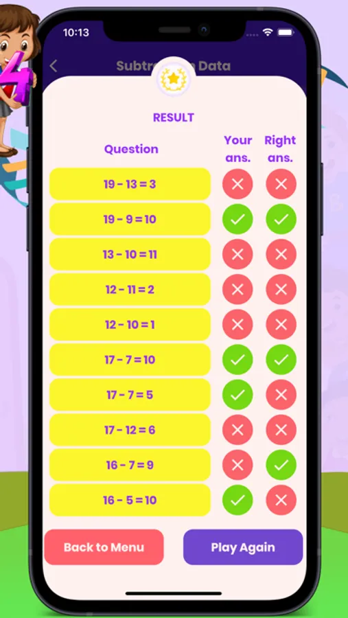 The app is designed with colorful and interactive graphics to keep children engaged and motivated. The gameplay is simple: children are presented with a math problem and must determine whether it is true or false by tapping on the corresponding button. The app provides instant feedback, indicating whether the answer is correct or incorrect.
