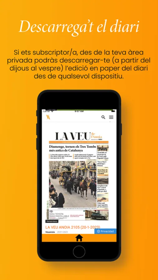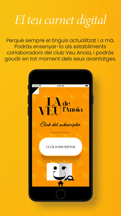 . Els subscriptors de l’edició impresa de La Veu de l’Anoia disposen d’avantatges (descomptes) per tota la comarca acreditant-se per mitjà del carnet digital (que també et pots descarregar des d’aquesta aplicació a l’àrea privada) o físic.