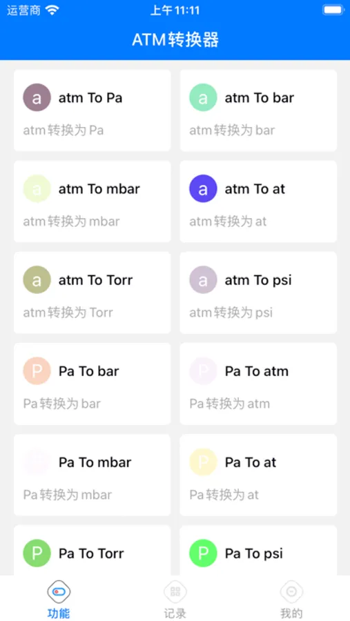 简易的ATM转换工具,支持包括atm,Pa,bar与psi等等之间的相互转换,掌上操作使用更方便~