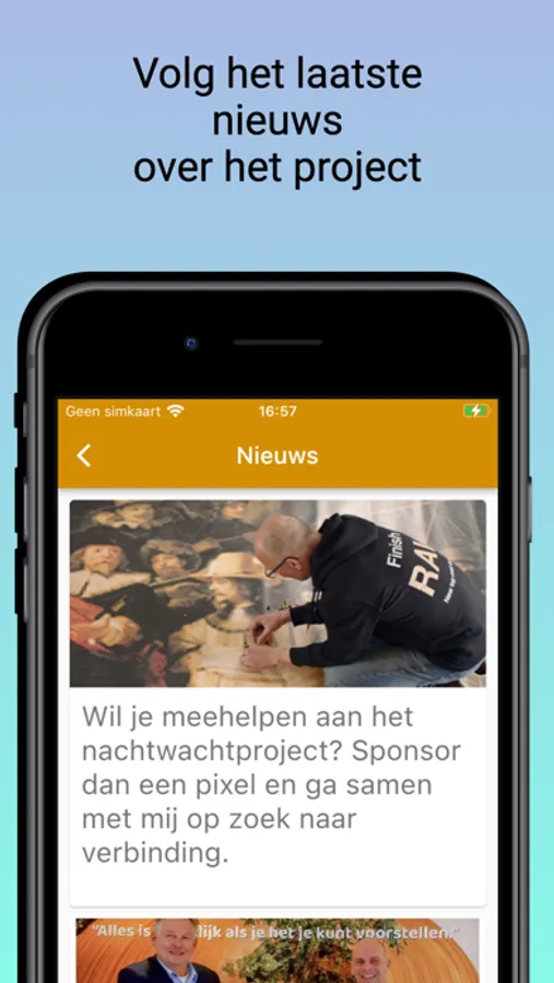 An educational app for Jakko Woudenberg's project - The Night Watch in Wood. Read all the news about the ambitious project, watch the documentaries or sponsorAn educational app for Jakko Woudenberg's project - The Night Watch in Wood. Read all the news about the ambitious project, watch the documentaries or sponsor a pixel! The ultimate goal of the app is for visitors to interact with the Night Watch in Wood.