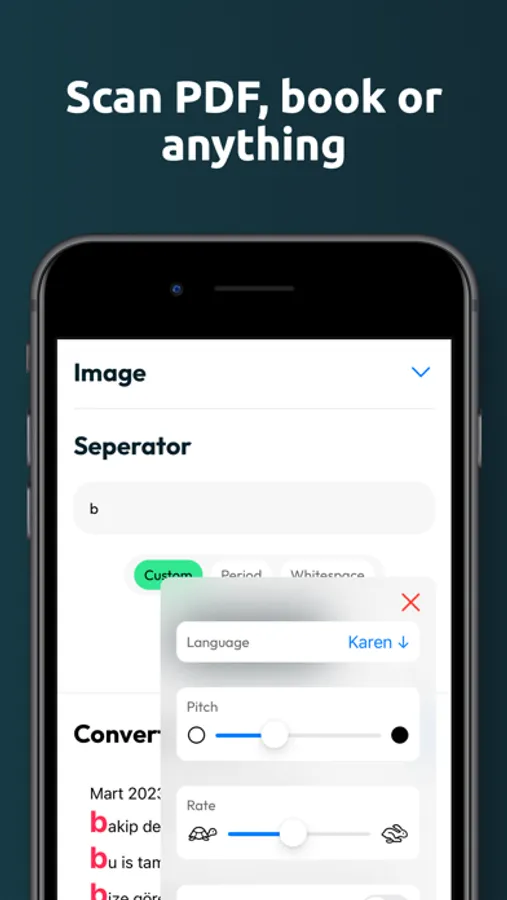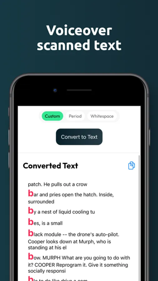 Dialogy allows you to grab any non-researchable and non-editable text on your device. Enhance your comprehension by simultaneously listening and reading. The text is instantaneously scanned and recognized by the high performant and accurate tools. Images nor speeches are not stored in any place. Your privacy matters to us.