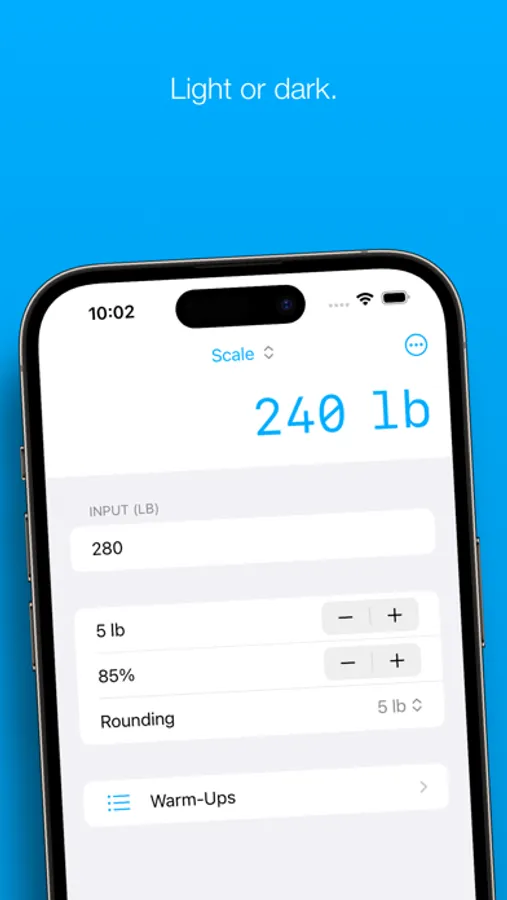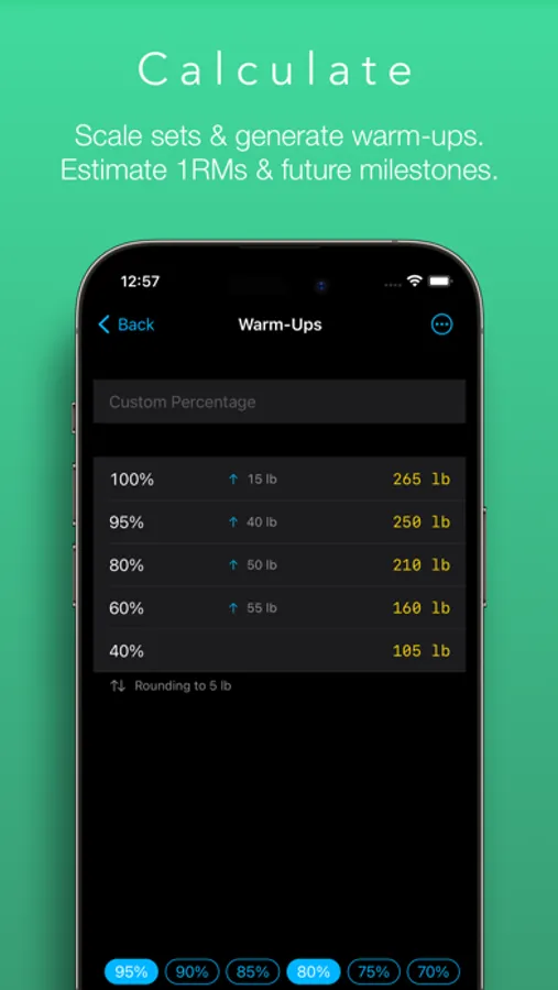 Once you’ve calculated your top set, it’s a cinch to produce a list of warm-ups by selecting from a list of common percentages. Lift Assist displays the weight increments between each warm-up set to help you optimise your routine for your condition on the day.