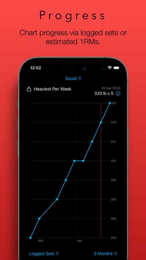 The Progress chart provides a sleek timeline of progress made for each lift. This chart emphasises the trend over time. Reviewing the last three months? You’ll see your heaviest lifts for each week. Reviewing the last year? You’ll see your heaviest lift for each month. Reviewing the last five years? The trend will still be clear.