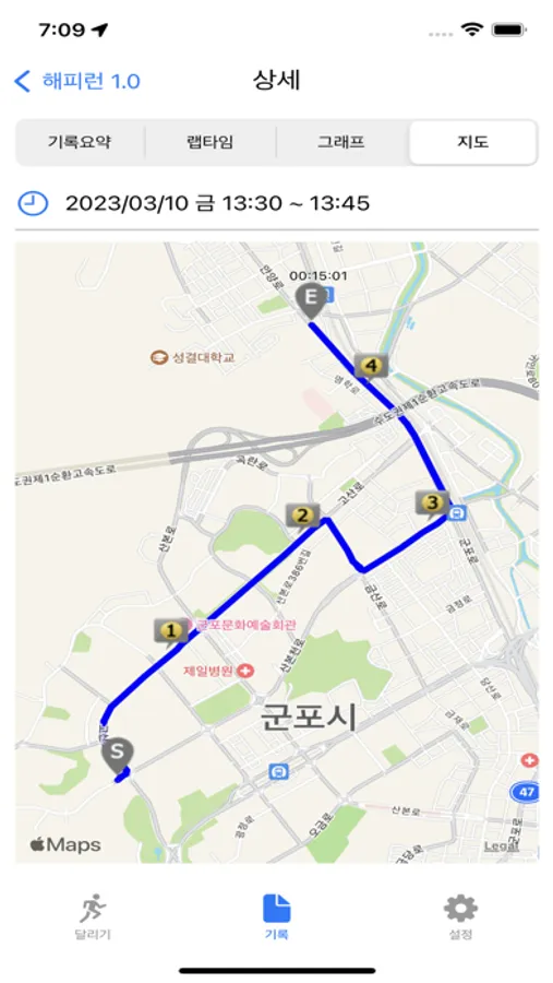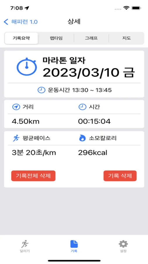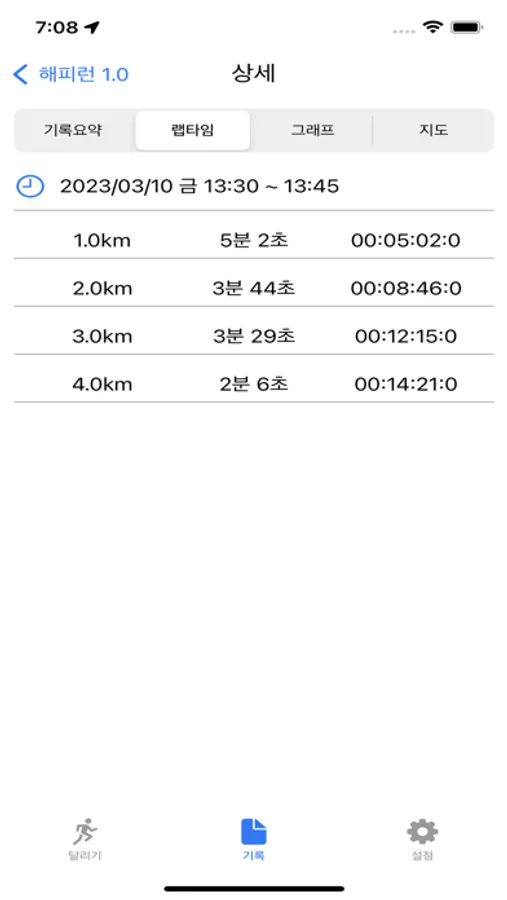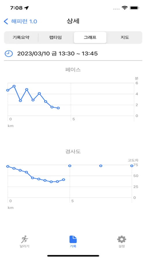 달기기 회차의 km당 랩타임과 속도/고도등을 그래프로 표시하고, 지도로 표시해줍니다.