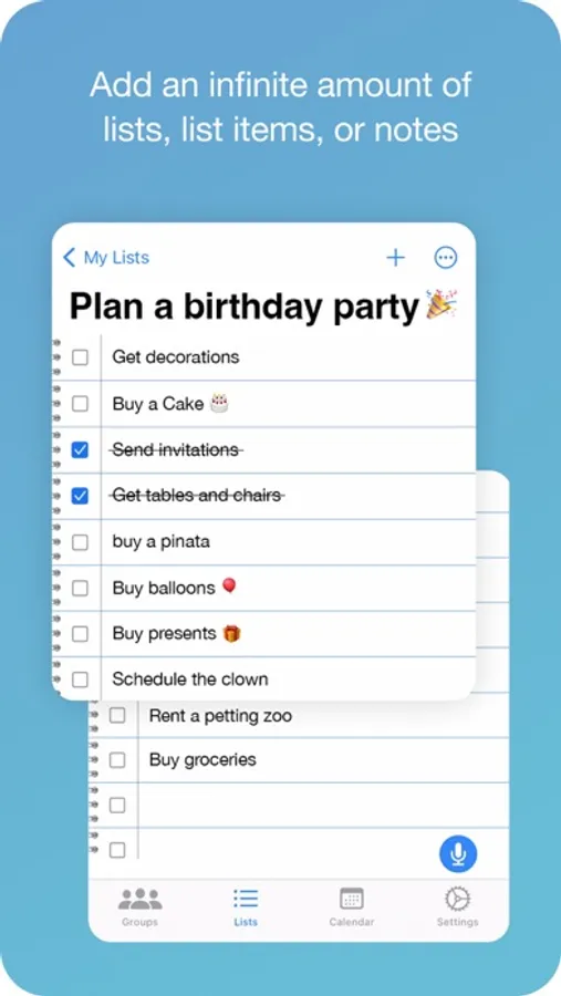 • Add an infinite amount of lists, list items, or notes