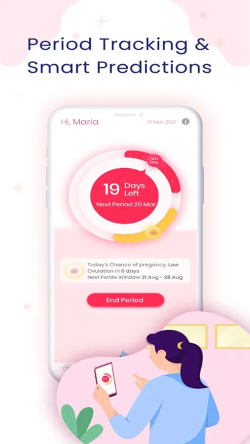 Holistic view of your monthly cycle tracking and smart predictions, like period, ovulation days, fertile & potential safe window, days left for next period. Option to start or end periods & log health symptoms.