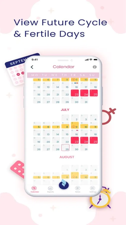 Get a handy calendar that helps you log in your period start date; it uses the colour code & symbols for identifying Bleeding days, fertile window, Ovulation day and PMS. It shows potential predictions for your upcoming six menstrual cycle to smartly plan your future life events.