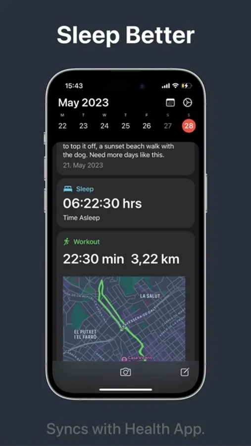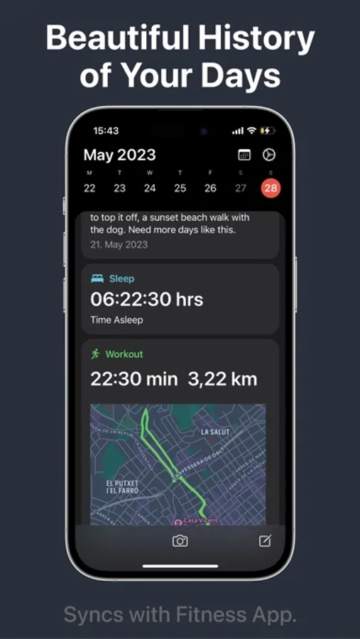 Reflective syncs effortlessly with HealthKit, enabling you to keep track of your physical activities alongside your journal entries. Document your workouts, monitor your sleep quality, and view your physical progress along your personal journey. Your health journey is a crucial part of your story, and with Reflective, it is beautifully presented alongside your daily reflections.
