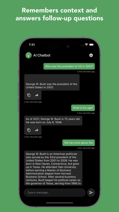 The first AI chatbot that remembers context and answers follow up questions. Ask anything and interact in a conversational way. Powered by OpenAI's ChatGPT APIs.