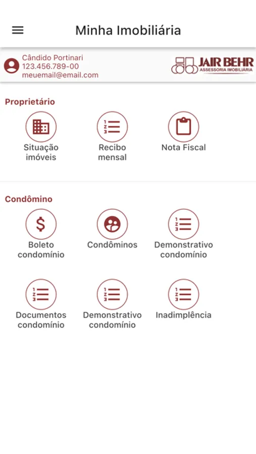 O aplicativo da Jair Behr Imóveis disponibiliza várias funcionalidades para proprietários, locatários, condôminos e síndicos.