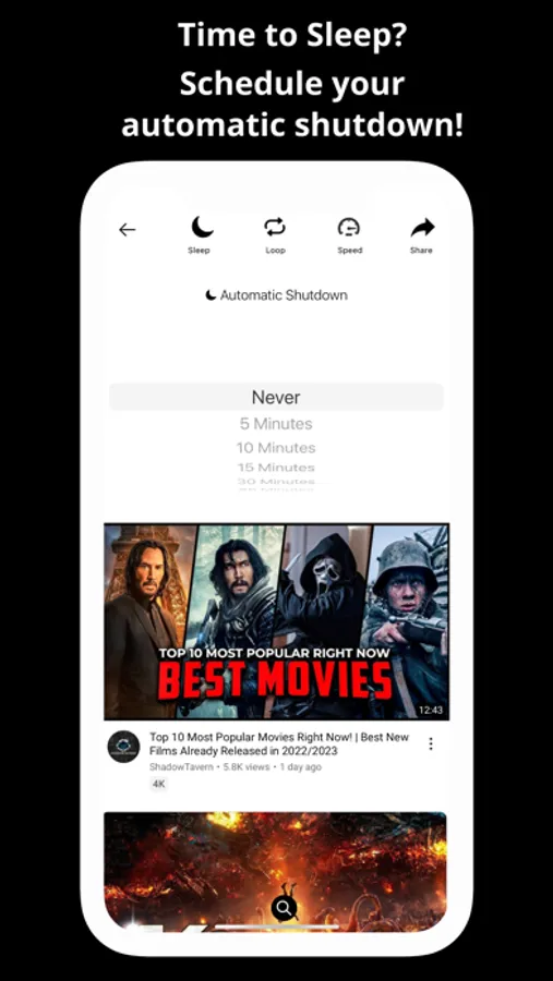 Bedtime? Find your YouTube video or playlist, program your automatic shutdown and let the audio of your favorite videos accompany you while you fall asleep.