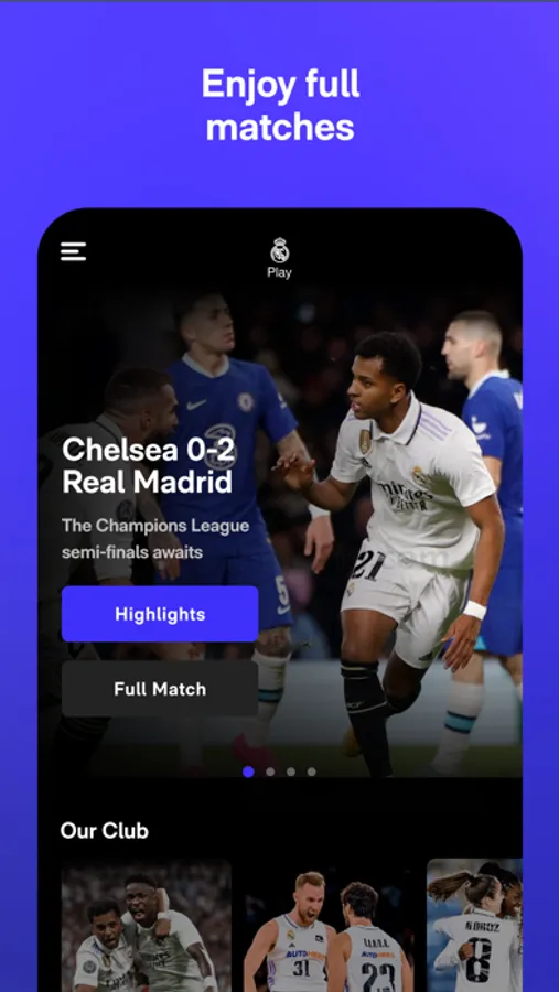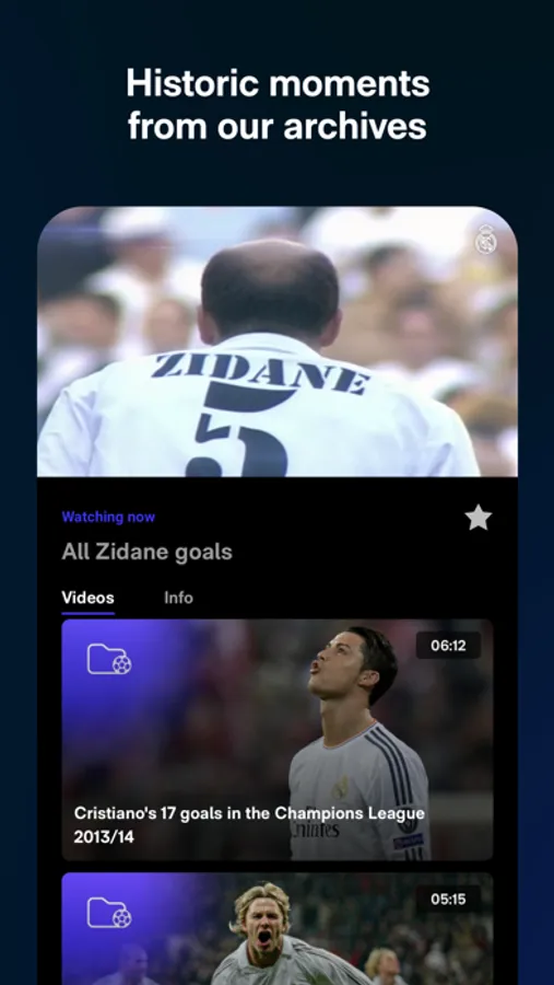 Immerse yourself in a world of exclusive Real Madrid video content, including electrifying highlights, live broadcasts of Real Madrid TV, in-depth documentaries, complete matches, and more. Access to some of the best content is reserved for Madridistas Premium members only.