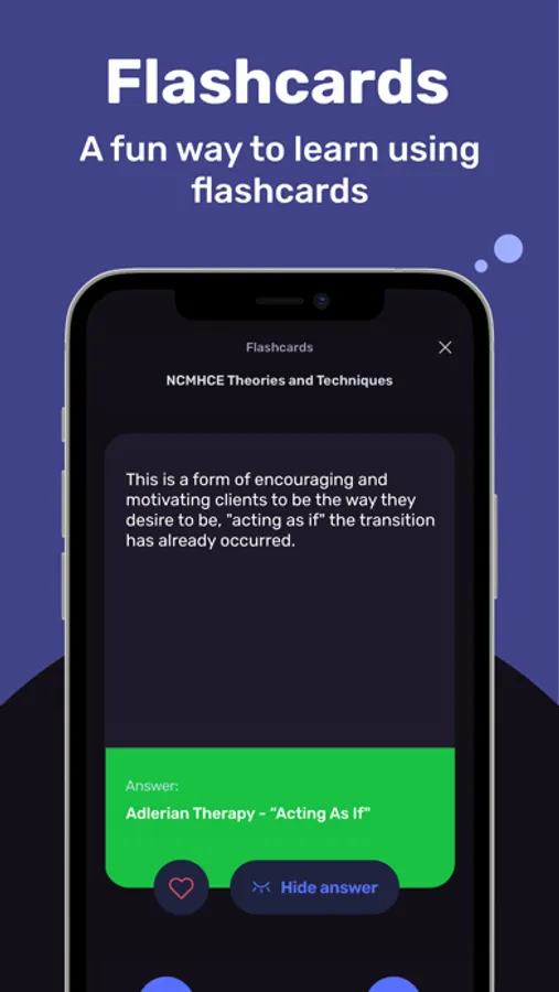 Swipe the cards to quickly review NCMHCE concepts without the need to go through the whole test, complete the right amount of questions for you, and get some quick studying in.