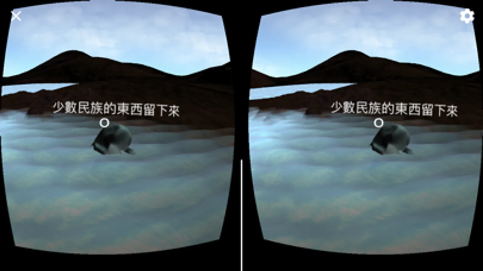 3.在場景中轉動頭部向四面八方觀看,低頭即可在場景中自由行走,抬頭即停止走動。尋找物件的連接按鈕,利用用畫面中心的小白點對準連接口物件,將發出不同音頻的提示音,發出提示音即表示對準成功,此時按下Google Cardboard的電容按鈕,即可跳轉到不同位置進行觀看。
