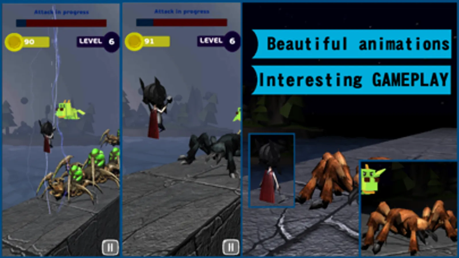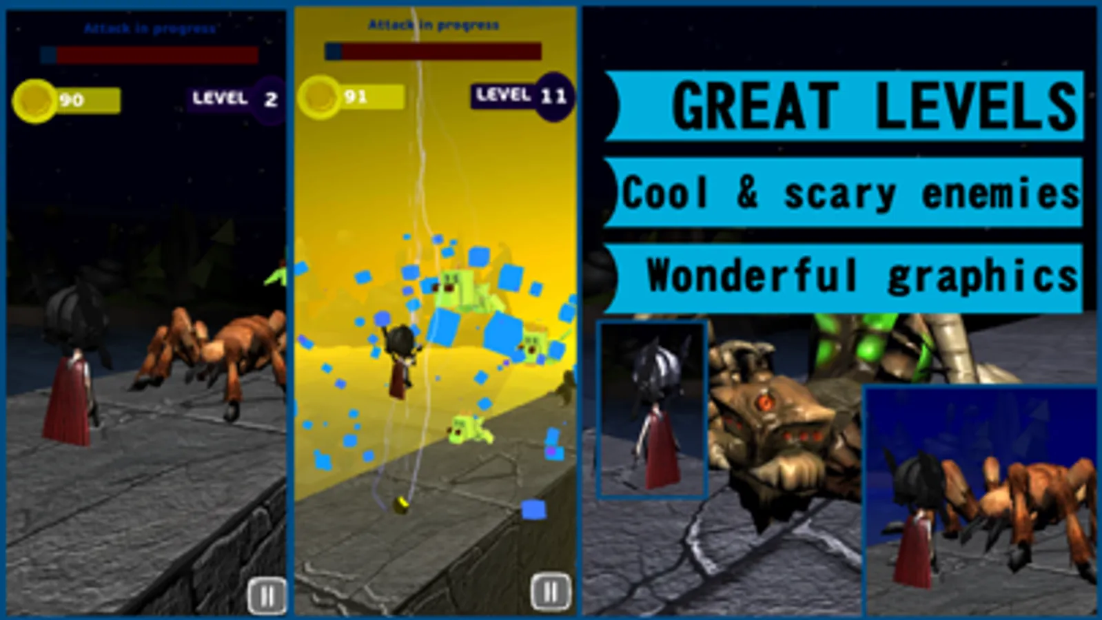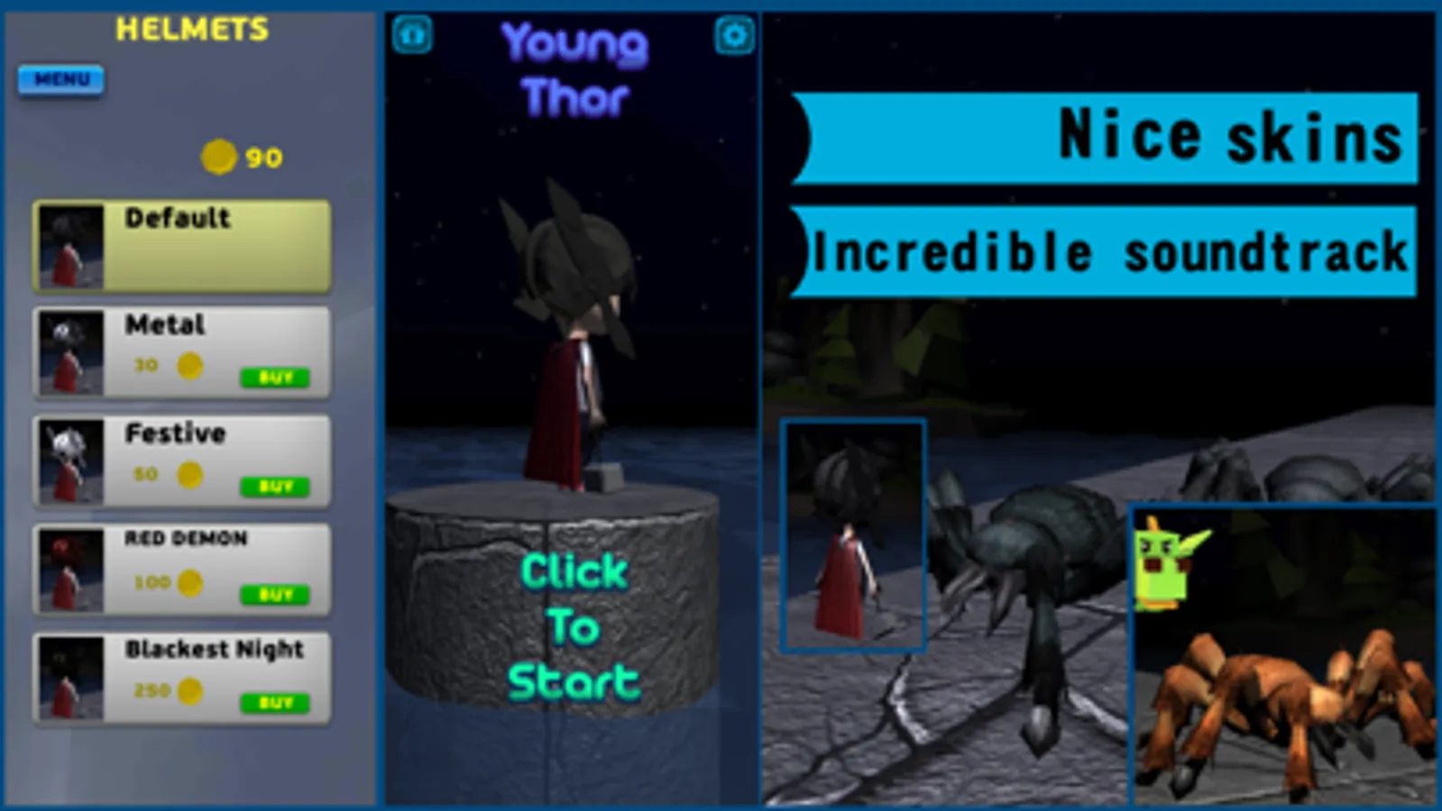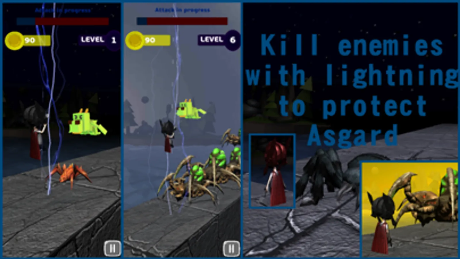 Hold to fly and to create lightning which will kill each enemy that lightning collisions with. Each enemy wants to destroy Asgard, so don't let them to avoid lightning and don't let them to touch you, because that will kill you. Sometime when you kill spider, dragon or other kind of strange creature you can get coin, which you can use to buy new helmets.