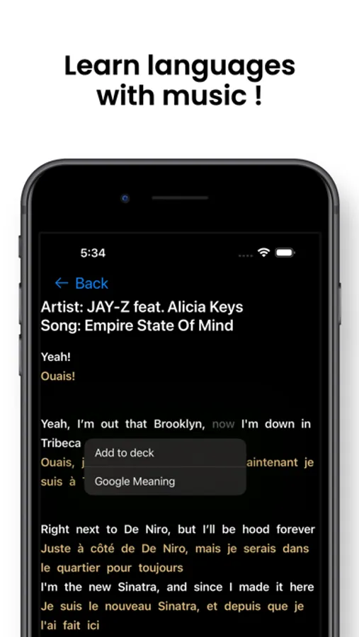With this app, you will not only enjoy listening to music, but you will also be able to learn a new language at the same time! You'll be amazed at how easily you can pick up a new language while enjoying your favorite songs.