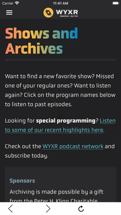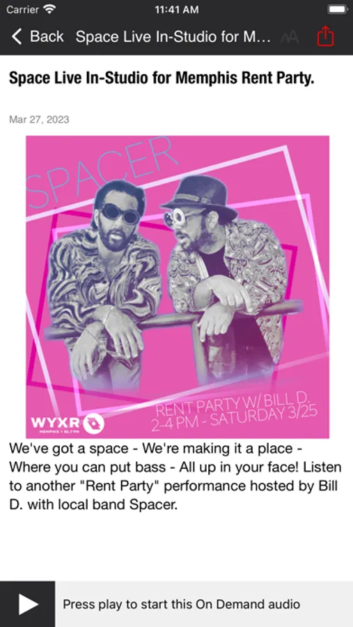 & more… Features include: - Real-time access to programming playlists: Tired of searching for the name of the song on the radio? Get instant information in-app about each song and artist played on WYXR. It’s just what you needed to follow your new favorite artists and albums. - Live announcements: Want to be the first to know when special guests, prize offerings, news and other exciting announcements hit the airwaves? Now you can be notified when something sensational is happening at WYXR. - Dig into our mission: Find out more about WYXR’s vision for building the morale of Memphis, using music as an ambassador to open its doors to the world.