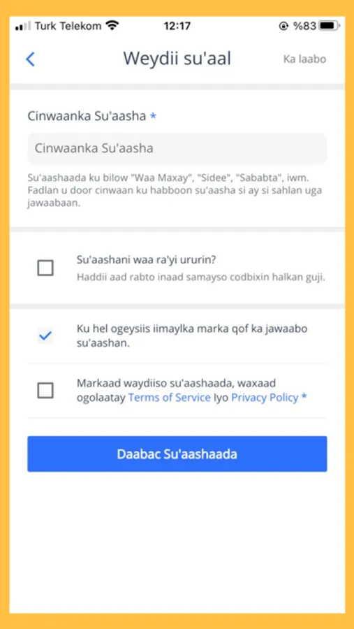 Caawiye Question and Answer waa goob su’aalo iyo jawaabo ah oo aad wax ku weydiin karto ama aad ka jawaabi karto su’aal, oo aad la wadaagi karto aqoontaada. looguna talagalay dadka xiisaha u leh ee raba inay wax badan ka bartaan adduunka mawduucyada sida cashirada schooka, jaamacadaha, sayniska, farshaxanka, ganacsiga, dhaqaalaha, siyaasada iyo dhaqanka. Astaanta udub-dhexaadka u ah abka waa xog-ururin ballaadhan oo su'aalo iyo jawaabo ah, oo daboolaya mawduucyo kala duwan, oo ay ku jiraan manhajka waxbarasho. Waa meel fiican oo aad jawaabaha uga heli karto dhammaan su’aalaha ka gubanaya, ama aad wax badan uga barato mawduuc aad xiisaynayso.