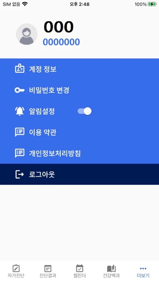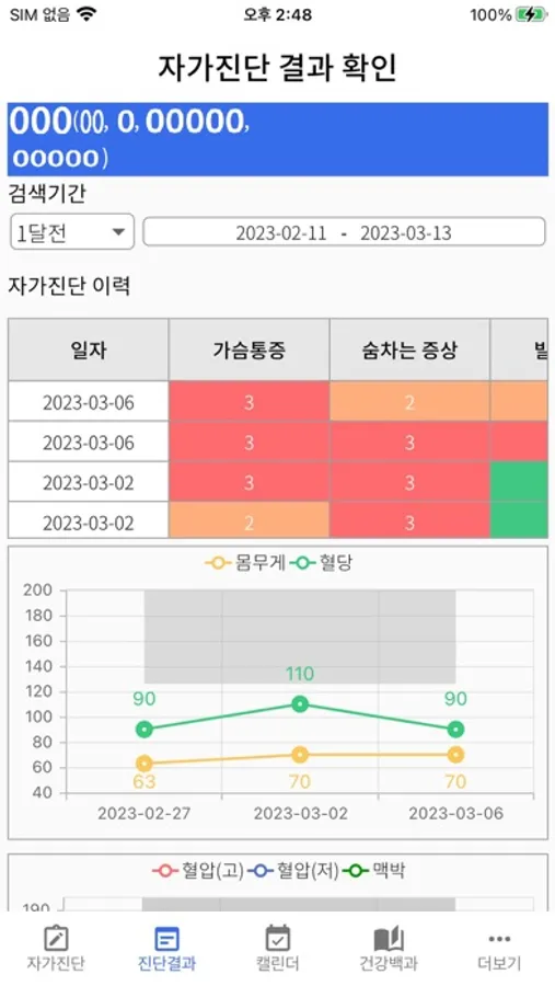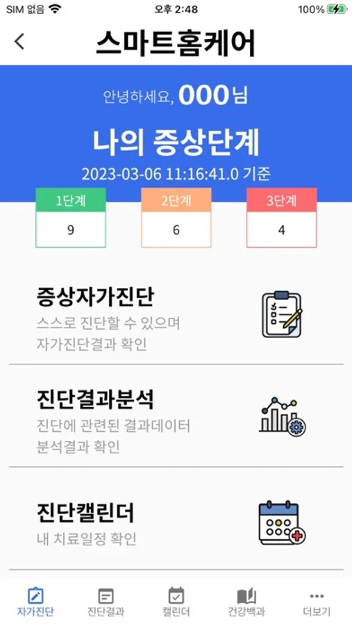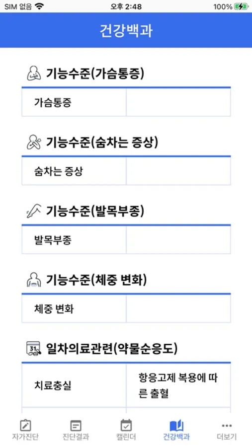 - 자가설문 : 증상 또는 건강행태 별로 설문을 통해 현재의 건강 상태에 대해 기록할 수 있습니다.
