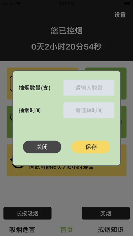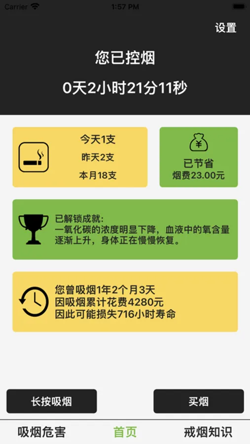 用户通过本APP可以轻松统计吸烟年限、花费金额、及日常控烟过程中吸烟、买烟、控烟时长和控烟以来节省的费用等数据;