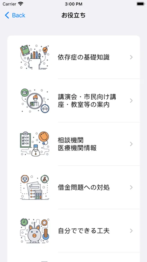 ギャンブル等依存症の診断のほか、ギャンブル等における金銭の管理やセルフケアについて日誌を付けることができます。また、ギャンブル等依存症と向き合きあうためのお役立ち情報も見ることができます。