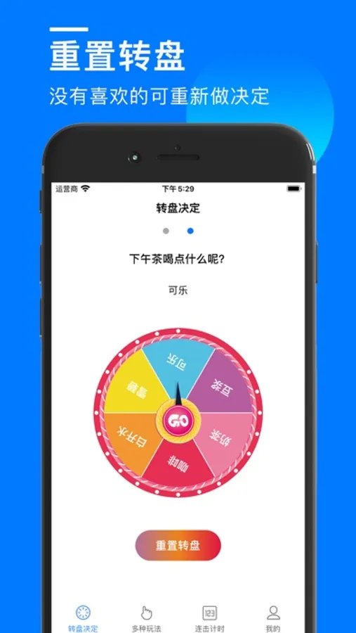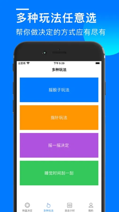 随机决定-告别选择困难症:一个用来帮助你快速做决定的应用。同时支持多种玩法:转盘玩法/摇骰子玩法/指针玩法/摇一摇玩法/刮一刮玩法!还提供一个连击计时的功能,输入点击时间和点击次数开始进行自动连击计时功能。