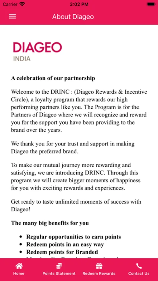Welcome to the DRINC : (Diageo Rewards & Incentive Circle), a loyalty program that rewards our high performing partners like you. The Program is for the Partners of Diageo where we will recognize and reward you for the support you have been providing to the brand over the years.