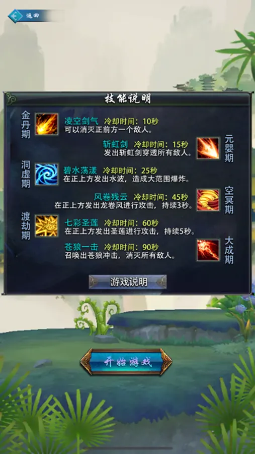 游戏中您的角色共有6个等级,分部为金丹期、元婴期、洞