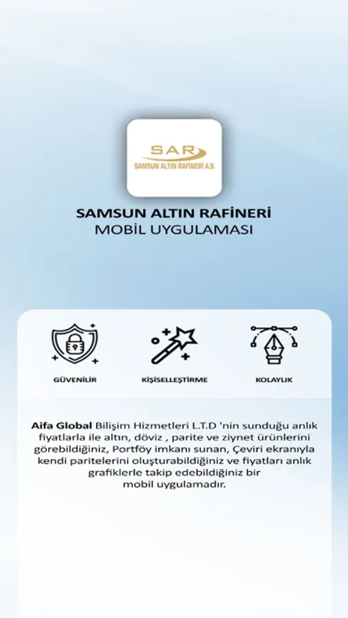 Aifa Global Bilişim Hizmetleri L.T.D 'nin sunduğu anlık fiyatlarla ile altın, döviz , parite ve ziynet ürünlerini görebildiğiniz , Portföy imkanı sunan, Çeviri ekranıyla kendi paritelerini oluşturabildiğiniz ve fiyatları anlık grafiklerle takip edebildiğiniz bir mobil uygulamadır.