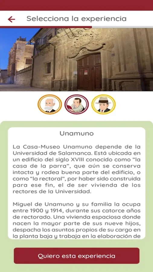 Una vez seleccionado el perfil, el usuario podrá acceder a unas de las tres experiencias de los 3 escritores, que, a partir de ese momento, le acompañarán en forma de narrador contando historias y curiosidades sobre los mismos.