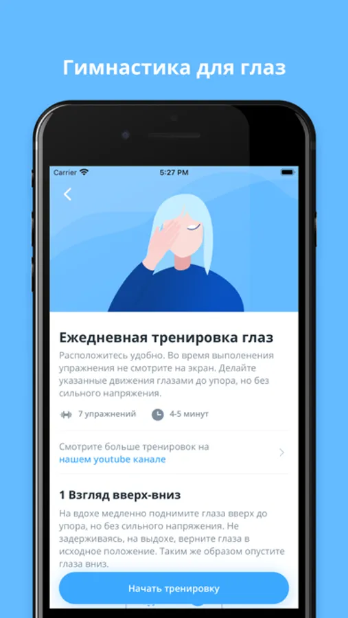 Замечание: имеются противопоказания. Проконсультируйтесь с офтальмологом по списку доступных упражнений. Любое упражнение можно пропустить, нажав кнопку «Далее».