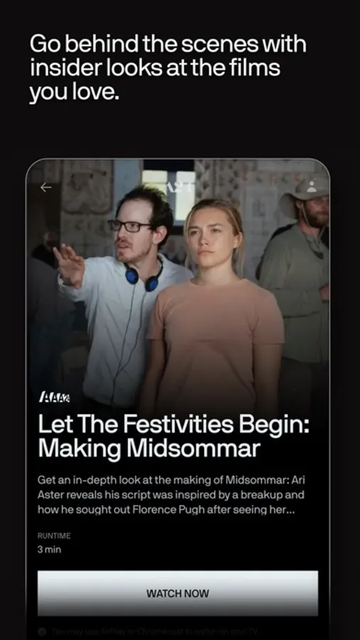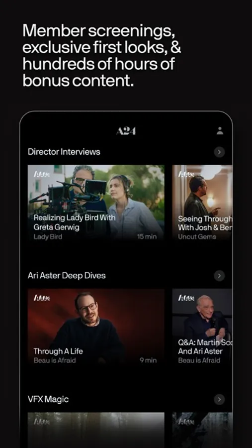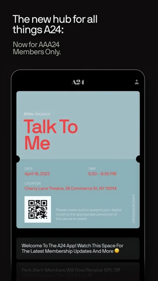 Unlock all the benefits of your AAA24 membership with the new A24 app. Exclusive perks, free screenings, our full library of bonus content, and your favorite A24 movies — all in one place.