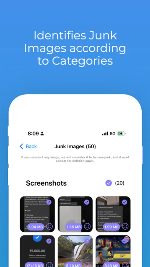- Gives you AI curated junk photos recommendation from your gallery and gives you option to delete them in few taps and clean you storage space.