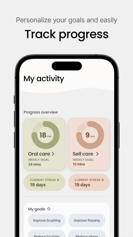 The purpose of this app is to help users maintain and learn more about the importance of oral health and wellness. Based on the oral and mental health assessment information collected, the app will help you set personalized goals to improve your oral and mental health – all at your own pace. Track week-by-week progress by completing goals in the ‘My Activity’ page, and earn rewards for reaching your goals and maintaining routines.