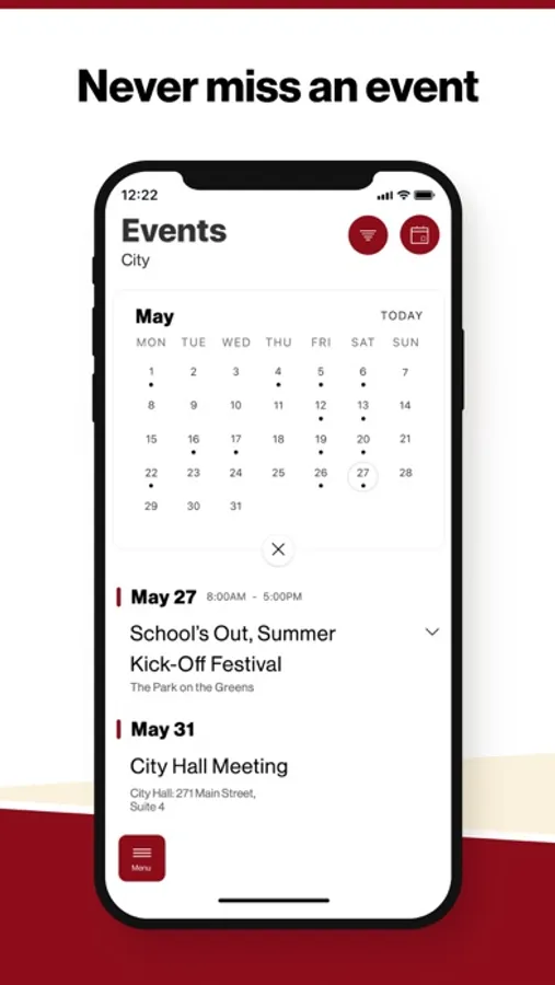 The event section shows a list of events throughout our community. Easily add an event to your own calendar and/or share the event with friends and family with one tap.