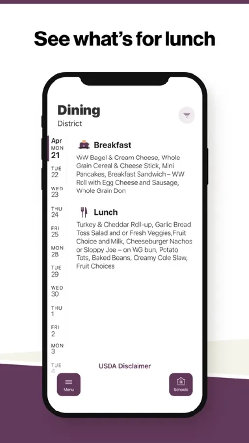 Within the dining section, you'll find an easy to navigate, weekly menu, sorted by day and meal type.