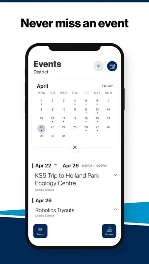 The event section shows a list of events throughout the district. Users can add an event to their calendar to share the event with friends and family with one tap.