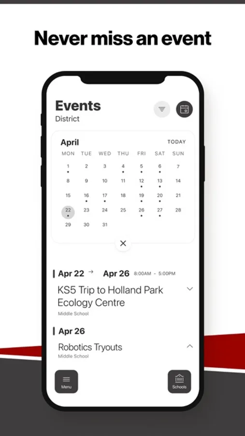 The event section shows a list of events throughout the district. Users can add an event to their calendar to share the event with friends and family with one tap.