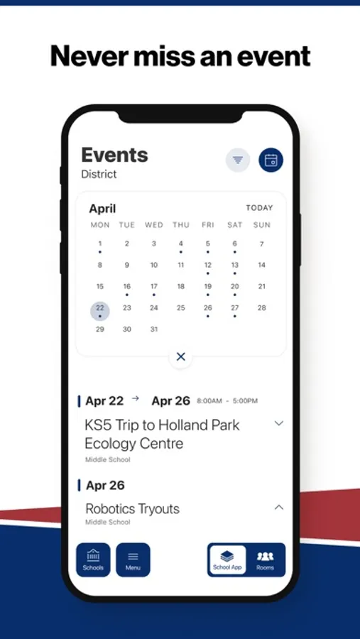 The event section shows a list of events throughout the district. Users can add an event to their calendar to share the event with friends and family with one tap.