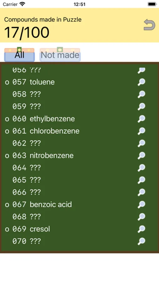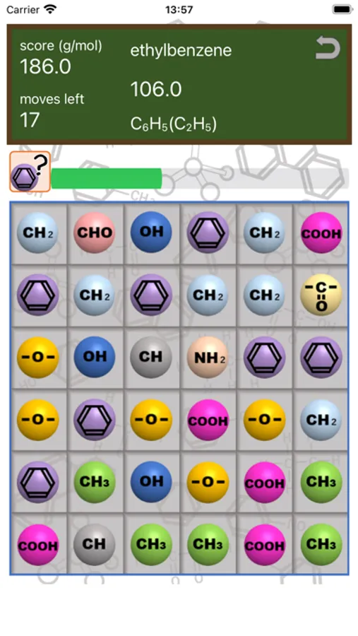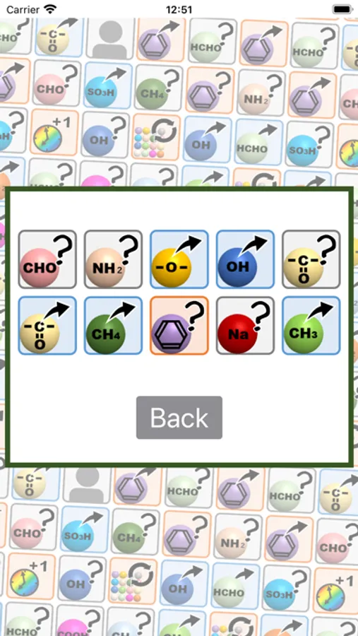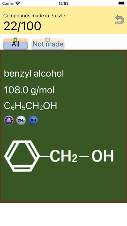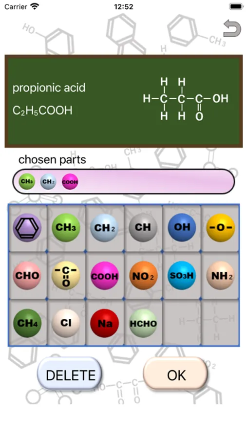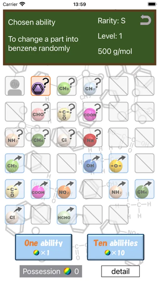 You can create compounds freely by tracing functional groups on the screen. You can create about 100 kinds of organic molecules. The score is high when you create complicated compounds. The collection shows compounds found. You can memorize the names of organic molecules with organic chemistry flashcards in Practice. You will learn organi chemistry while enjoying this game.