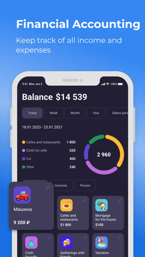 The application will automatically calculate the current account balance and show the structure of expenses (expenses and receipts) in the form of a visual diagram;