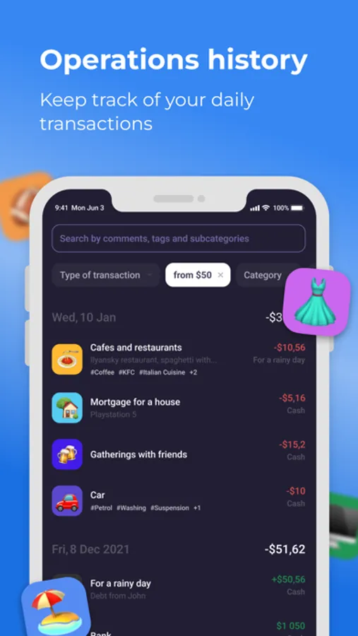 View details for any period of time, for any category of operations, for any tag and amount of the operation - as it will be more convenient for you;