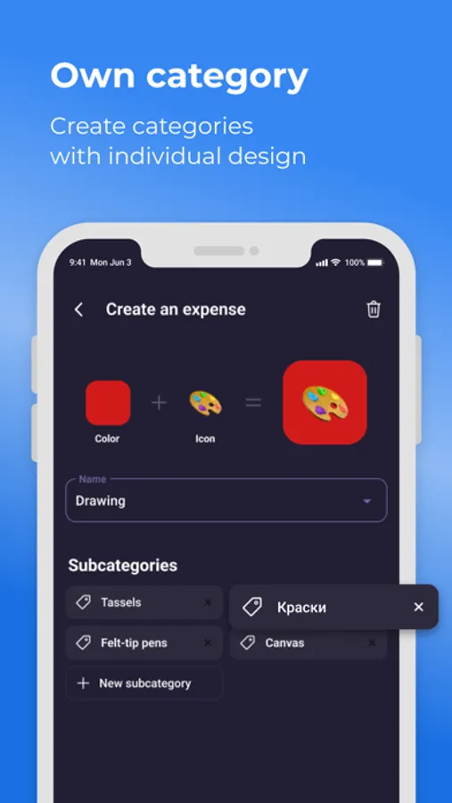 Use ready-made templates (products, hobbies, utility bills, etc.) or create your own categories, assign any colors and names to them, so that the application is as convenient as possible for you;